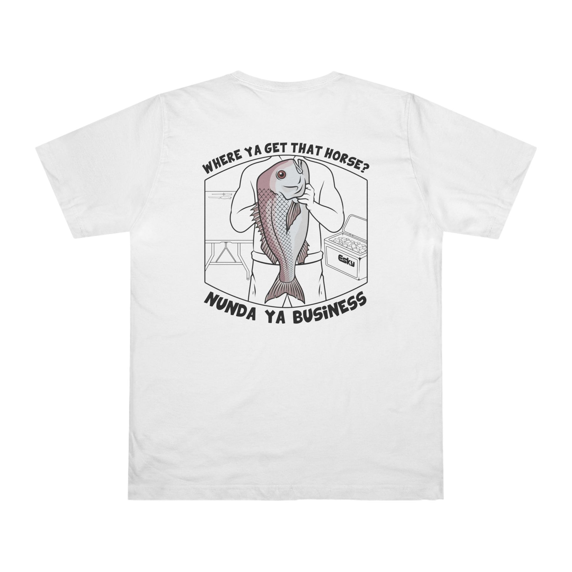 We thought it was about time we play on where our name originated from, check out this Nunda Ya Business Pink Snapper design on the men's tee